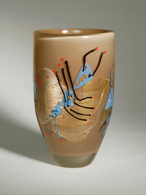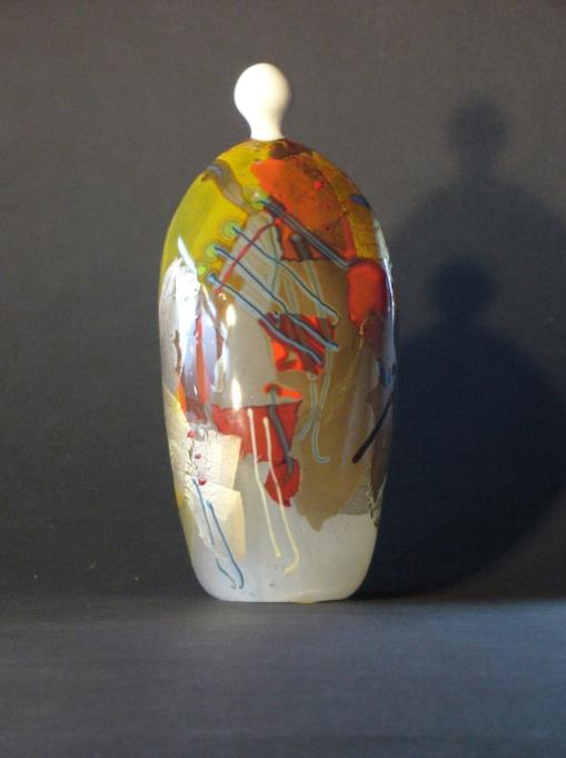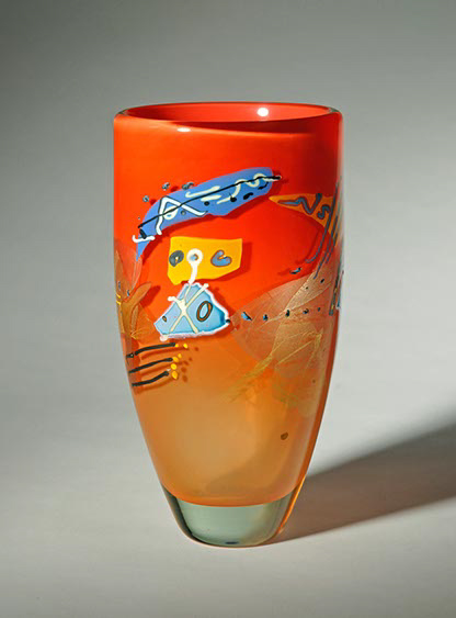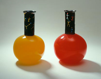 Die Gefäße sind entweder konkrete geometrische Grundformen oder vom Glasfluss sich selber herleitend (Heißes Glas hat eine ganz besondere innewohnende Art zu fließen, sich zu bewegen, abzukühlen…, die nur minimal in Richtung Gefäßgestaltung beeinflusst wird, z.B.: ein Boden zum Stehen).
